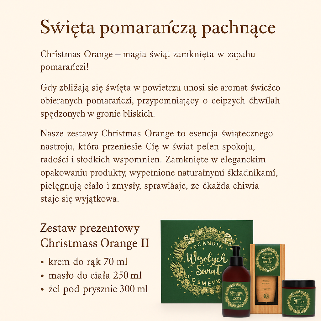 Nasz wyjątkowy zestaw Christmas Orange to harmonijne połączenie pielęgnacji, aromaterapii i świątecznego nastroju. Każdy produkt został stworzony z myślą o tym, aby zamienić codzienną pielęgnację w mały rytuał relaksu. Soczysty, naturalny zapach świeżo obieranej pomarańczy otula zmysły i wprowadza atmosferę ciepła, radości oraz świątecznej magii.
